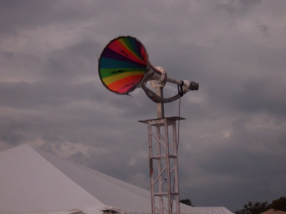 I changed into some dry clothes, took a piss, bought a beer, and then hunkered down in the hippie-fest that is a Flaming Lips crowd. Though it was dark and drizzly, it was impossible to miss the cloud of pot smoke hovering near the stage. There were kids dressed like X-Men and Astronauts, chicks with balloon animal hats, face paint: basically all your typical Flaming Lips freaks. The show started, the clouds parted, and The Flaming Lips bombared the crowd with streamers, confetti, massive ballons, and super-trippy music. Oh, the music was trippy. The band opened with “Race for the Prize” which was so sun-shiny-super that it banished all memory of the terribly cold rain. The band’s stage show is the stuff of legend, and I’m here to tell you: it’s all true. The confetti blizzard, the strange characters (giant rabbits stalking through the crowd), Wayne climbing in the plastic ball and running over the crowd, the lasers…it’s all true.