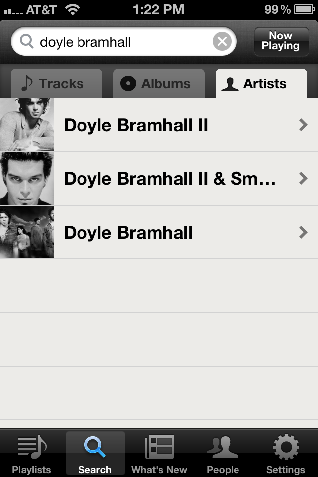 And it’s here, with a actual paid accounts, that Spotify stumbles a bit. First, there are two tiers one that gives you unlimited music on your computer, with no commercials for $4.99 a month. That’s a really good deal considering all that you are getting (millions of songs with new stuff being added daily). The Premium service is $9.99 a month and gives you all that plus you can have Spotify on your phone. Having Spotify on the-go in theory is really cool. But the app for the iPhone is clunky and cumbersome. It’s not as easy to navigate as the computer-based version of Spotify. In addition, it’s greatly stripped down: there is no “artist radio stations” on the current phone app, there is also no way to check out similar artists–a feature I love on the computer version of Spotify. If, like me, you enjoy hoping from artist to artist exploring new music the phone app will leave you cold. In addition, the app is designed around the idea that you’re going to use the playlist feature. Like I stated earlier, I like listening to ALBUMS not PLAYLISTS. I’m old school, and if you’re old school too you’re going to have to make playlists of albums. The app also is a data-plan and battery killer. My iPhone almost never goes dead but with a 45 minute trip to the gym (where I rock out) my iPhone loses 30-45% of it’s battery life. That’s a pretty noticeable drain.